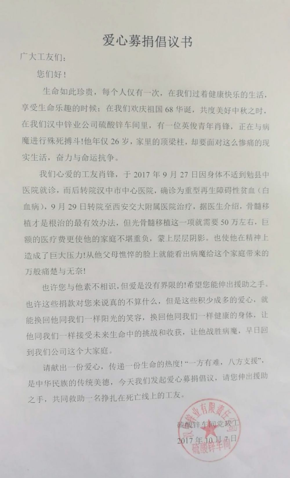 肖鋒,陜西勉縣同溝寺人,2016414日到漢中鋅業(yè)硫酸鋅車間工作,2017年元月轉(zhuǎn)為公司協(xié)議工。2017927日,肖鋒經(jīng)漢中市中心醫(yī)院確診為重型再生障礙性貧血(白血病),轉(zhuǎn)院至西安交通大學(xué)附屬醫(yī)院住院治療。骨髓移植才是根治的最有效辦法,才能挽救肖鋒的生命!突如其來(lái)的噩耗和籌借巨額的醫(yī)療費(fèi)用讓一個(gè)普通的農(nóng)民家庭悲痛欲絕……