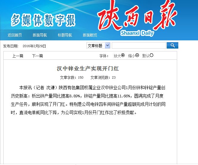 陜西日報 漢中鋅業(yè)生產(chǎn)實現(xiàn)開門紅